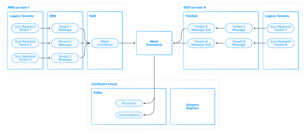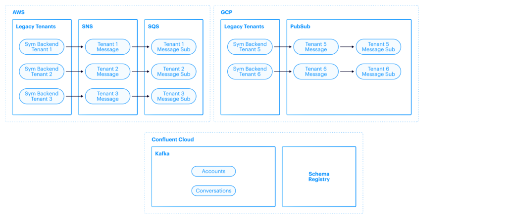 In our journey building an event mesh, we face the challenge of reconciling with Symphony’s engineering history. Specifically, we are transitioning from a single-tenant, monolithic architecture to a multi-tenant, microservice architecture. And critically, due to the nature of our business, this shift must be both progressive and smooth.