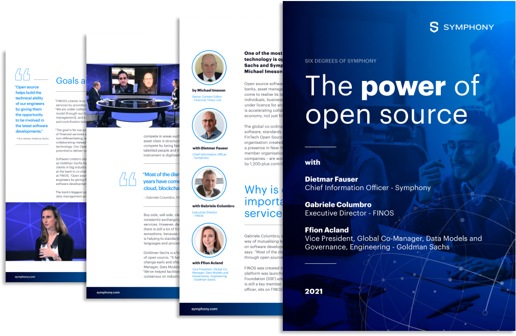 Download the in-depth article discussing the adoption and innovation of open source, with a perspective from Symphony, Goldman Sachs and FINOS. Learn how open source helps build the technical ability of engineers, and why it’s the driving force behind disruptive innovations such the cloud, blockchain and big data.