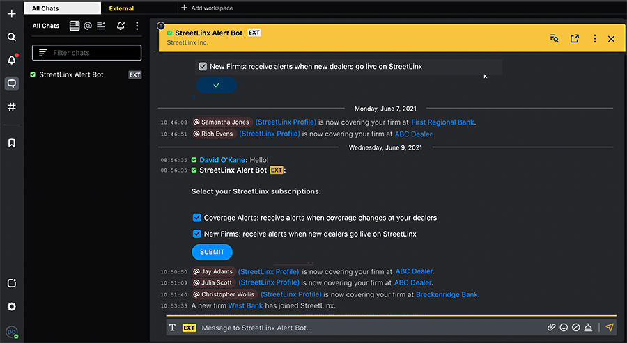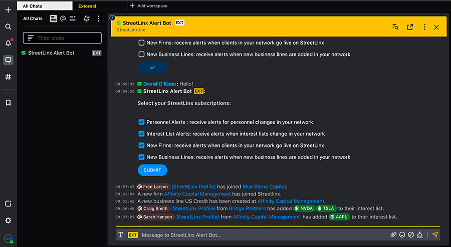 Sell-side Symphony users with entitlements on StreetLinx can open a channel with the bot and subscribe to specific alert types such as interest list updates, new strategy launches and personnel changes updated by their clients. On the other hand, buy-side users can subscribe to alerts such as changes in sales coverage across their dealer counterparts