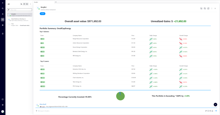 Symphony would like to congratulate the winning team – students from Muhlenberg College – Derek Levine, Ethan Ruoff and Jonathan Maron, who developed the Portfolio Management Bot. This Symphony Bot provides portfolio managers a seamless solution to monitor portfolio performance and allocate trades across different portfolios under management.