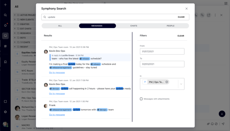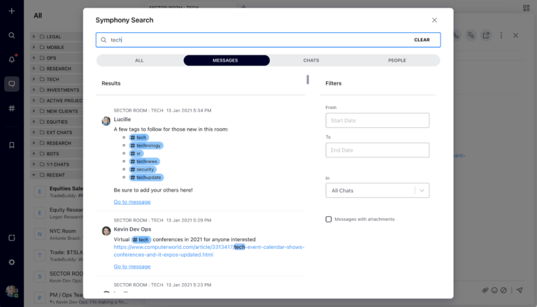 Individually, these new search features and functionalities can help you more easily keep track of messages and locate the important information you need. Collectively, they play an important role in making the overall Symphony 2.0 experience faster and more intuitive. We hope they will make your searches simpler, swifter, and more productive.