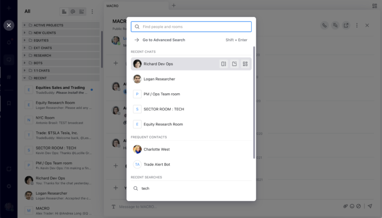 The three main search tools in Symphony 2.0 are quick search, advanced search, and in-room search. In Symphony 2.0, these tools work together. Quick search is designed to help you quickly find the people and chats you’re looking for with convenient and ready access to frequent contacts, recently opened chats, and previous searches. Adding the ability to open search with a keyboard shortcut – CTRL + K for our PC users or CMD + K for those on Mac – makes navigating even easier.
