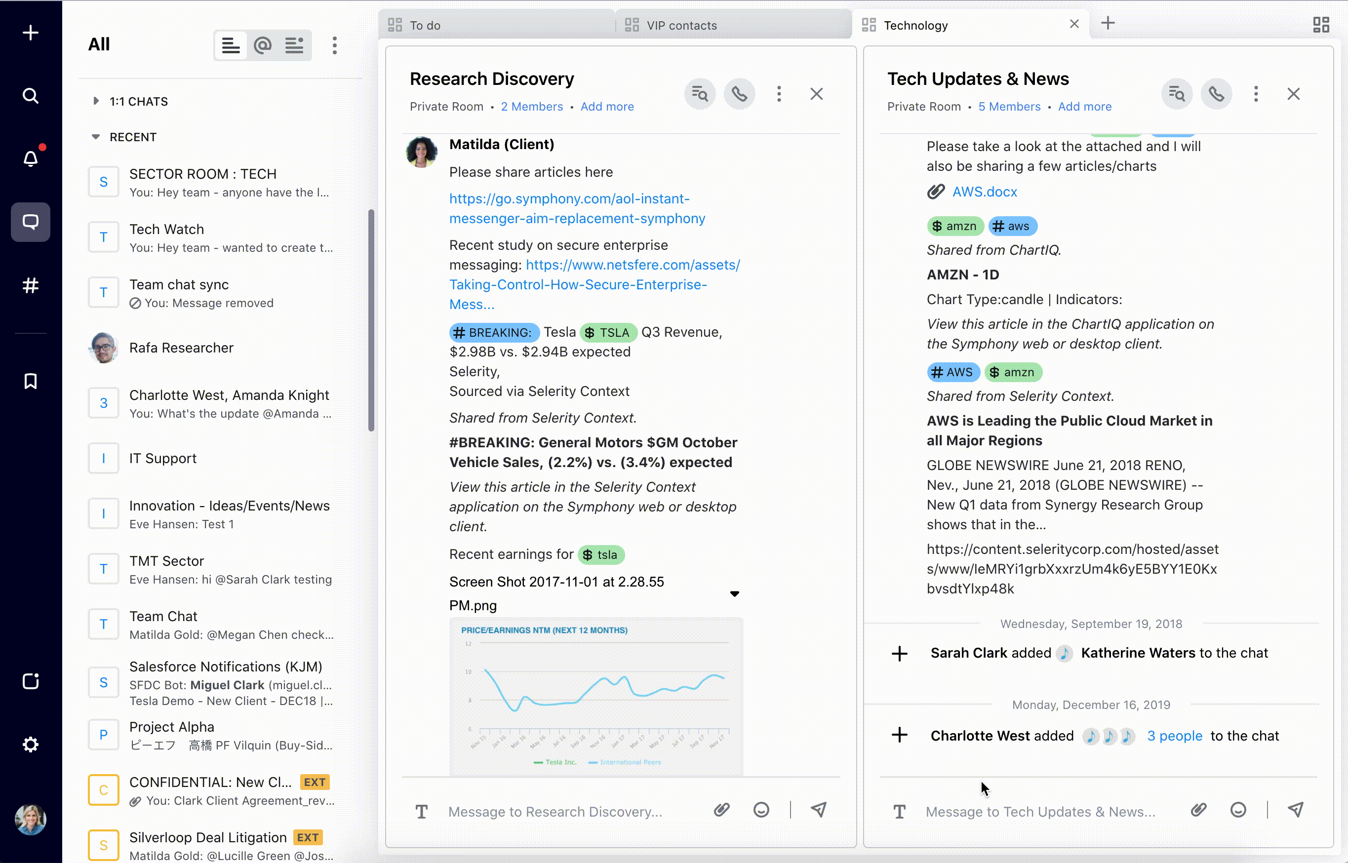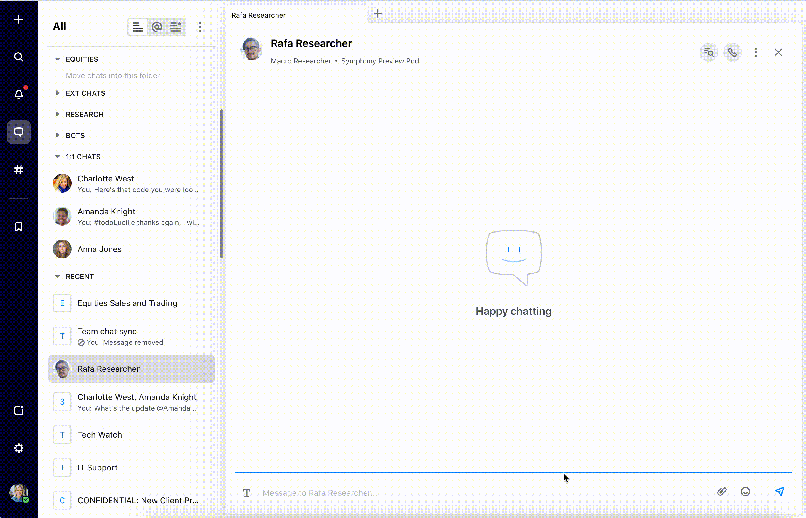 It sounds simple, but we’ve heard from users that this feature is a game-changer. Workspaces enable you to move quickly between chats, applications, and other modules saved to the same grid, as well as help ensure that you never lose track of an important chat. For example, a trader or salesperson can leverage workspaces to simultaneously monitor incoming chats from multiple clients, and respond quickly to time-sensitive messages. A researcher or IT manager can group conversations by project or topic, and monitor dashboards and integrations.