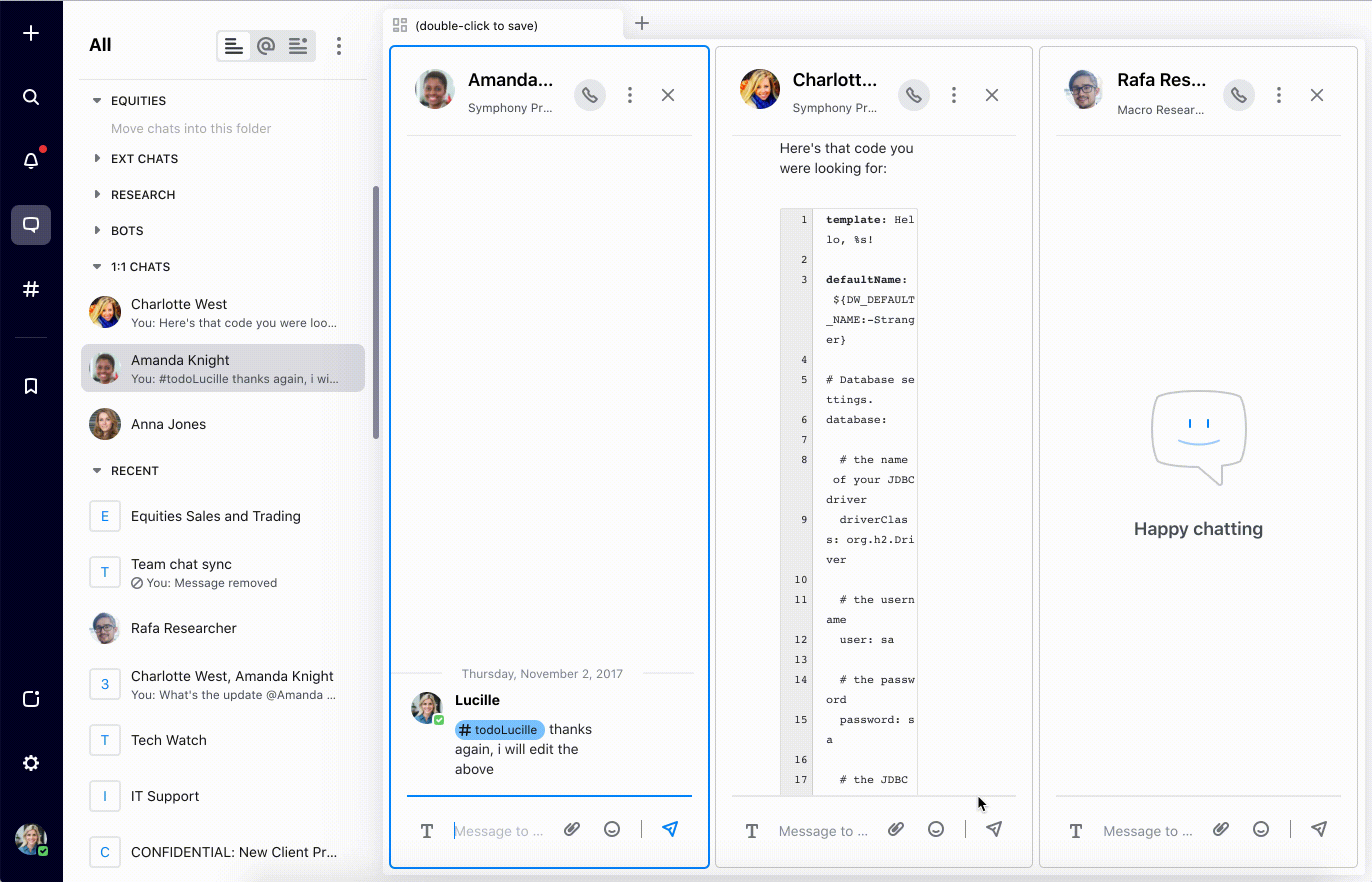Once you’ve positioned the chats you want to include, name the tab to save it as a workspace that you can close and relaunch at any time.