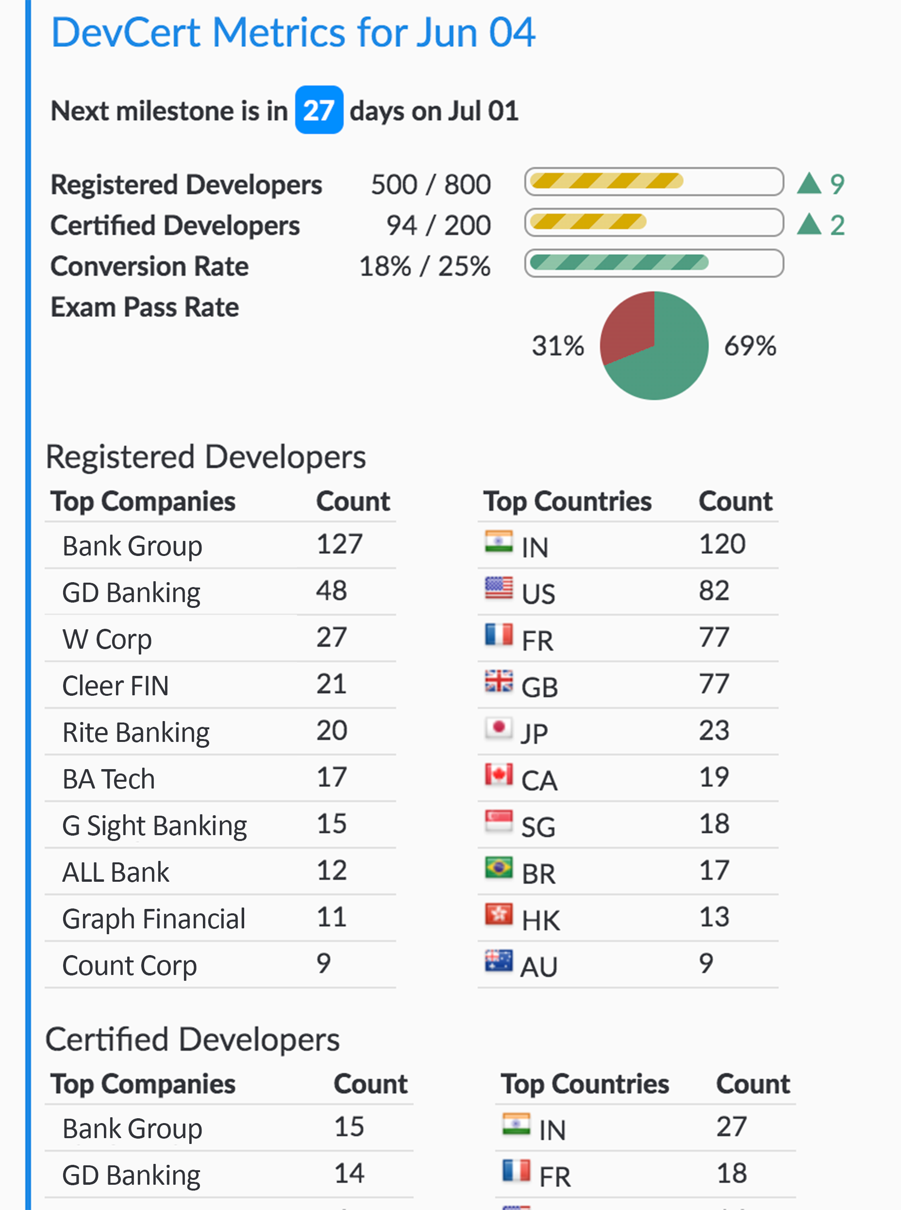 Bernard also automates a repetitive administrative task: tracking the key metrics associated with the Developer Certification Program. This bot sends our internal Developer Relations team a daily recap via Symphony message outlining: