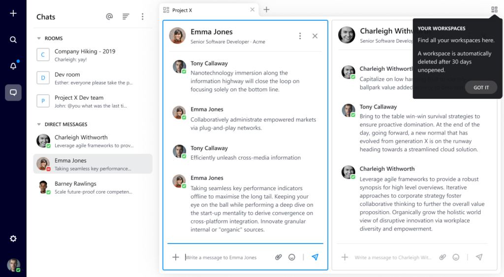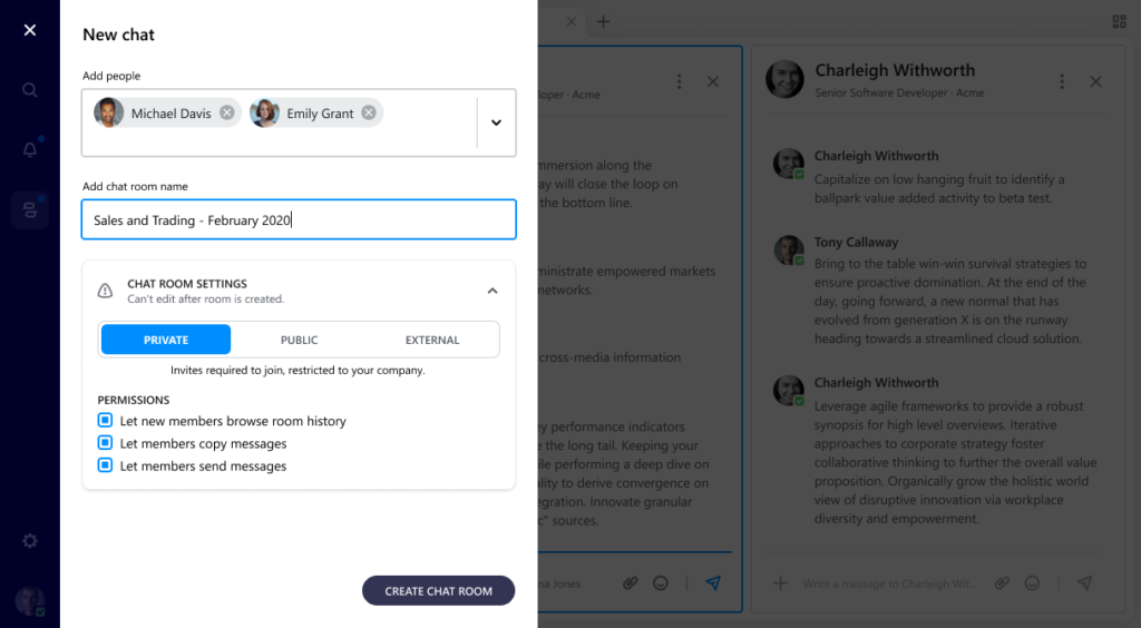 Every user interaction on 2.0 has been optimized for simplicity and performance, and we’ve introduced “progressive disclosure” for complex interactions. So, as you move through an action – let’s say creating a chat room – additional customization options will appear in a clear sequence of steps, as opposed to a barrage of settings and input fields all at once.