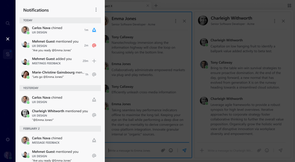 Given that notifications are the first thing you look at when you open your computer, we designed Symphony 2.0 to help you more easily differentiate between the signal and the noise. Simple cues like color-coding help you determine at a glance which conversations to read first, and new settings designed to control and prioritize alerts help ensure you never miss an important message.